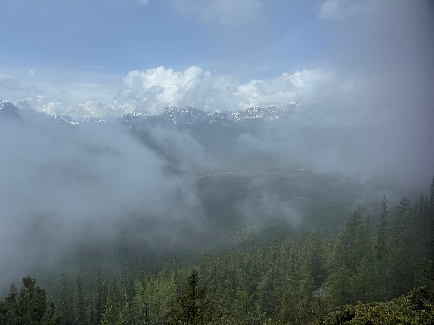 Um uns körperlich wieder etwas zu betätigen, hatten wir uns für den vor Banff liegenden Castle Mountain Lookout Hike entschieden, der einen schönen Blick über das Bow Valley versprach. Mit 7,4 km hin und zurück gut machbar, lediglich die zu erklimmenden 520 Höhenmeter sollten noch für etwas Unmut sorgen, wie man auch auf den Bildern erkennen kann. 😉 So richtig im Bärenland angekommen war uns dann auch etwas mulmig, als keinerlei andere Fahrzeuge am Streckenbeginn standen und wir nach knapp 150 Metern einen riesigen Haufen Kot fanden. Zum Glück hatten wir neben unseren Bärenglocken und dem Bärenspray (entsichert und direkt in der Hand) auch Musik auf dem Handy. Zu den gehaltvollen Klängen u. a. von AC/DC erreichten wir – mehr oder wenig frisch – den leider etwas wolkenverhangenen Aussichtspunkt.